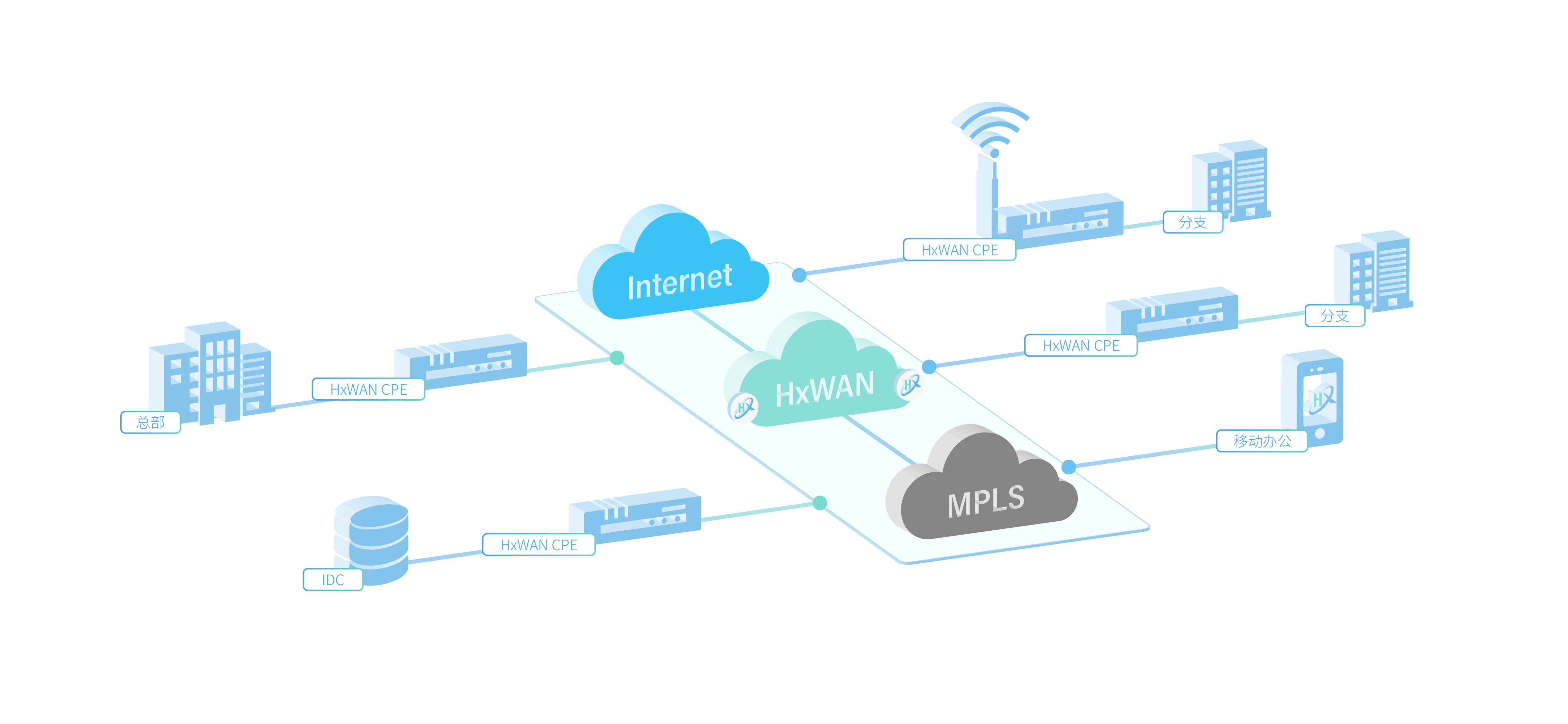 分别在企业总部及各国外分支办公网络中部署华夏创新 HxWAN 专用接入设备,通过本地互联网链路与就近的华夏创新 HxWAN POP 节点进行虚拟隧道对接,从而实现各办公子网与华夏创新 HxWAN 传输优化网络的对接;然后通过华夏创新 HxWAN 网络中转,实现分支机构间的私网互联。华夏创新 HxWAN 已在全球基于公有云平台搭建了一张巨型网络,目标是无死角覆盖全球,并且可以根据企业分支需求快速开通 POP 节点,帮助企业在任何地点、任何时间快速搭建与全球任何地方快速互联的网络,适用于走出国门的“一带一路”企业集团分支与总部互联、与 SaaS 和公有云互联。