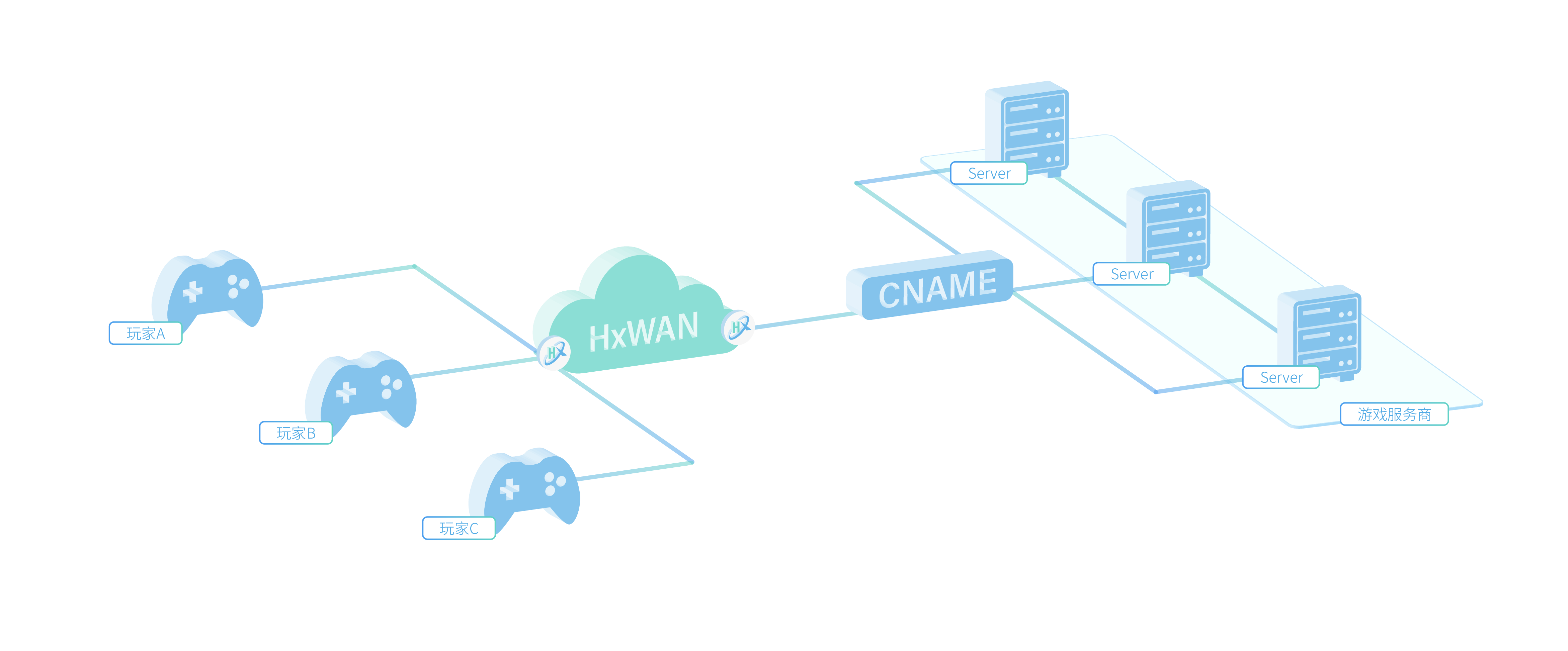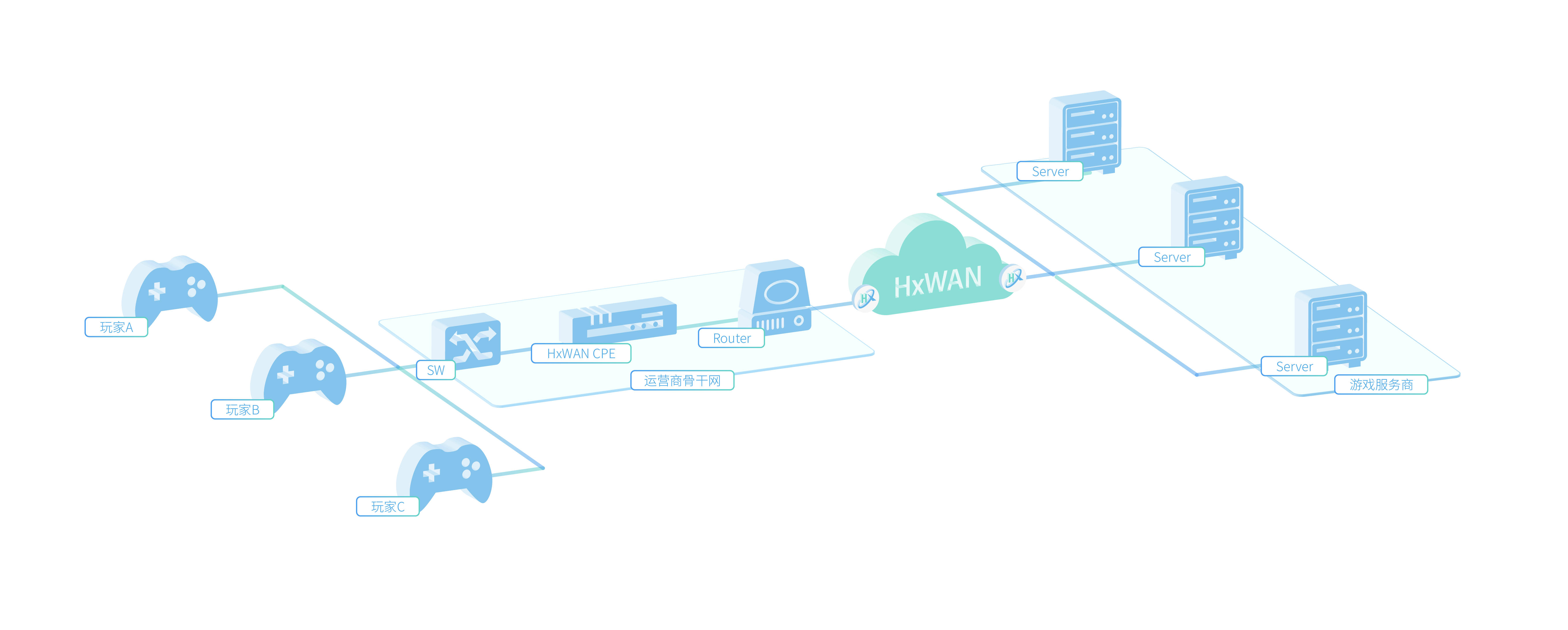 当玩家选择海外服务器时,无论是运营商还是游戏提供商只需将此游戏的流量送入HxWAN中,HxWAN控制台会根据目标服务器所在位置,智能选择路由,提供链路,极大的提升玩家游戏体验。