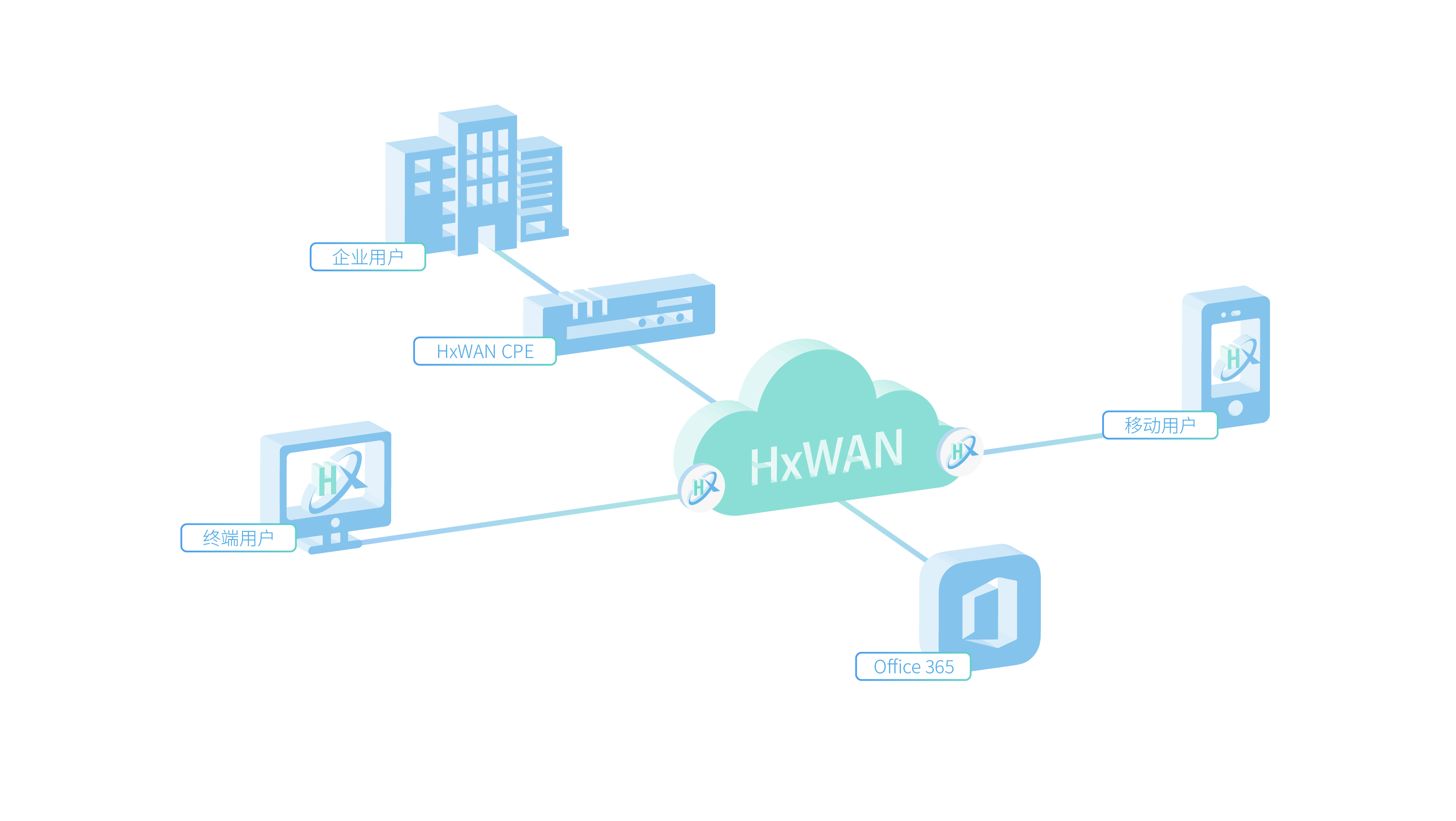 华夏创新 HxWAN 通过在企业用户网络中部署专用接入设备 HxWAN CPE,将用户访问 Office 365 的业务流量接入运营网络中。用户也可通过安装华夏创新 HxWAN 客户端软件以解决移动办公中对 Office 365 服务访问优化的需求。